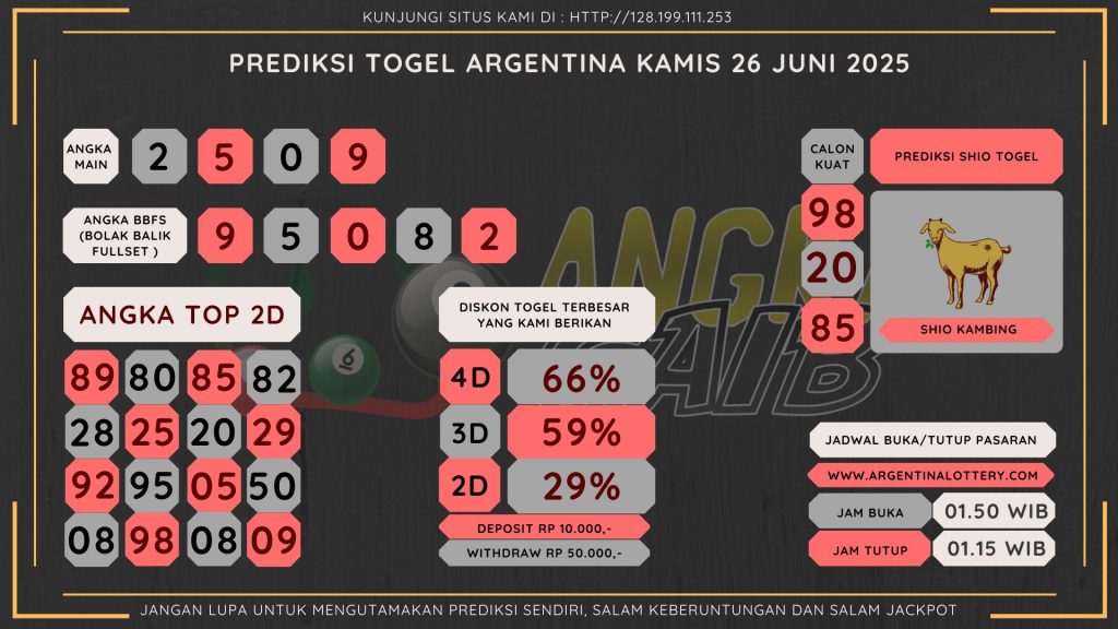 ANGKA JADI – Selamat datang kembali di situs prediksi Argentina. Kami kembali hadir untuk memberikan prediksi pasaran Argentina yang tentunya menjadi salah satu pasaran paling populer yang sangat sayang untuk anda lewatkan pastinya. Pasaran Argentina sendiri sudah cukup punya nama bagi kalangaan pecinta togel online. Disini kami akan memberikan prediksi yang bisa anda gunakan untuk melakukan bettingan di situs togel online. BANJIR SKETER DISINI Untuk result pasaran togel Argentina resmi bisa anda cek di situs : www.argentinalotteria.com. Dan untuk livedraw nya bisa anda cek secara lengkap di situs yang sudah kami sediakan yaitu di situs : http://167.71.212.184/ . Untuk jadwal pasaran togel Argentina adalah sebagai berikut :