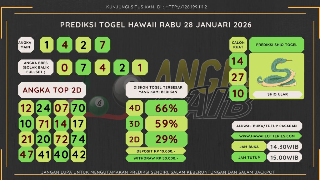 ANGKA JADI– Selamat datang kembali di situs prediksi Hawaii. Kami kembali hadiruntuk memberikan prediksi pasaran Hawaii yang tentunya menjadi salah satu pasaran paling pop46uler yang sangat sayang untuk anda lewatkan pastinya. Pasaran Hawaii sendiri sudah cukup punya nama bagi kalangan pecinta togel online. Disini kami akan memberikan prediksi yang bisa anda gunakan untuk melakukan bettingan di situs togel online. BANJIR SKETER DISINI Untuk result pasaran togel Hawaii resmi bisa anda cek di situs : www.hawaiilotteries.com. Dan untuk livedraw nya bisa anda cek secara lengkap di situs yang sudah kami sediakan yaitu di situs : http://167.71.212.184/ . Untuk jadwal pasaran togel Hawaii adalah sebagai berikut :