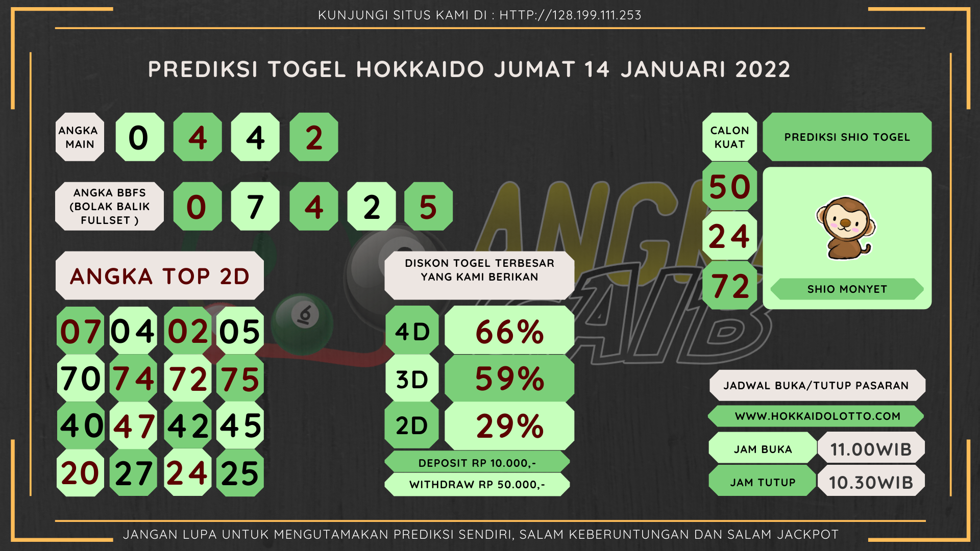 ANGKA JADI – Selamat datang kembali di situs prediksi Hokkaido. Kami kembali hadir untuk memberikan prediksi pasaran Hokkaido yang tentunya menjadi salah satu pasaran paling populer yang sangat sayang untuk anda lewatkan pastinya. Pasaran Hokkaido sendiri sudah cukup punya nama bagi kalangan pecinta togel online. Disini kami akan memberikan prediksi yang bisa anda gunakan untuk melakukan bettingan di situs togel online. Untuk result pasaran togel Hokkaido resmi bisa anda cek di situs : www.hokkaidolotto.com. Dan untuk livedraw nya bisa anda cek secara lengkap di situs yang sudah kami sediakan yaitu di situs : http://167.71.212.184/ . Untuk jadwal pasaran togel Hokkaido adalah sebagai berikut :