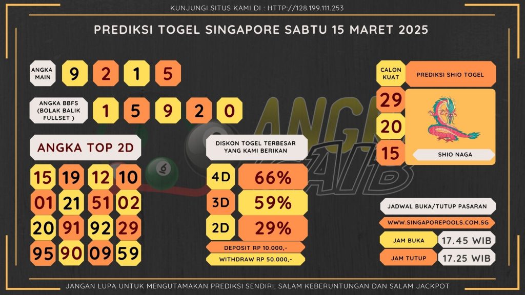 ANGKA JADI – Selamat datang kembali di situs prediksi Singapore. Kami kembali hadir untuk memberikan prediksi pasaran Singapore yang tentunya menjadi salah satu pasaran paling populer yang sangat sayang untuk anda lewatkan pastinya. Pasaran Singapore sendiri sudah cukup punya nama bagi kalangan pecinta togel online. Disini kami akan memberikan prediksi yang bisa anda gunakan untuk melakukan bettingan di situs togel online. BANJIR SKETER DISINI Untuk result pasaran togel Singapore resmi bisa anda cek di situs : www.singaporepools.com.sg. Dan untuk livedraw nya bisa anda cek secara lengkap di situs yang sudah kami sediakan yaitu di situs : http://167.71.212.184/ . Untuk jadwal pasaran togel Singapore adalah sebagai berikut :