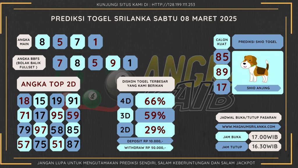 ANGKA JADI – Selamat datang kembali di situs prediksi Sri Lanka. Kami kembali hadir untuk memberikan prediksi pasaran Sri Lanka yang tentunya menjadi salah satu pasaran paling populer yang sangat sayang untuk andaaewatkan pastinya. Pasaran Sri Lanka sendiri sudah cukup punya nama BANJIR SKETER DISINI bagi kalangan pecinta togel online. Disini kami akan memberikan prediksi yang bisa anda gunakan untuk melakukan bettingan di situs togel online. Untuk result pasaran togel Sri Lanka resmi bisa anda cek di situs : www.magnumsrilanka.com. Dan untuk livedraw nya bisa anda cek secara lengkap di situs yang sudah kami sediakan yaitu di situs : http://167.71.212.184/ . Untuk jadwal pasaran togel Sri Lanka adalah sebagai berikut :
